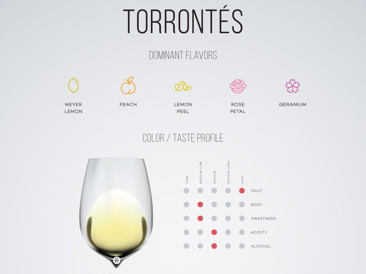 La Torrontés, así como la Chenin Blanc, la Gewürztraminer o la Riesling son uvas que dan vinos blancos muy aromáticos, extremadamente afrutados, y de buena acidez. Considerada la marca registrada de los vinos blancos argentinos, esa uva blanca comenzó a destacar en Argentina en la década de 1970.